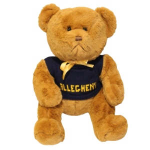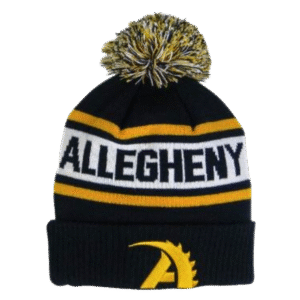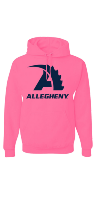 Navy hooded pullover sweatshirt. Gold Allegheny College text with mom text below.