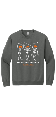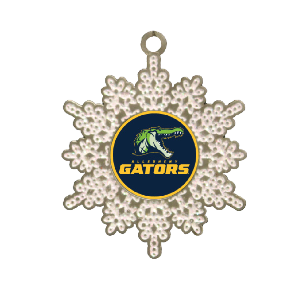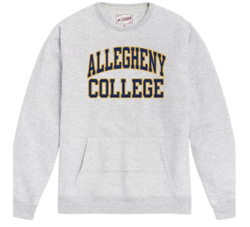 Gray long sleeve crew neck sweatshirt with an Allegheny College Wordmark logo. Each letter in Allegheny has a unique plaid or dotted design. Below the wordmark is a Mom imprint in Navy with a gold outline.