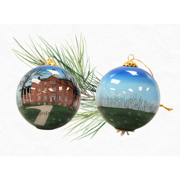 Ornament featuring a hand-painted winter scene with Bentley Hall and measures about 3″ in diameter. #411344