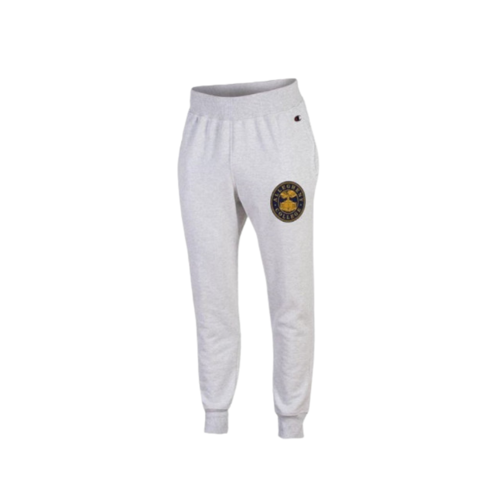 Gray Champion joggers with left pant silk screen imprint. 23% polyester, 77% cotton, unisex sizing. #309216
