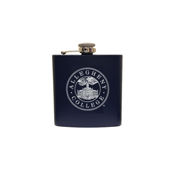 Cobalt, metal 6 oz. flask featuring the college seal. Flask measures 3.5″ x 4.25″ x .75″ with laser engraved imprint.