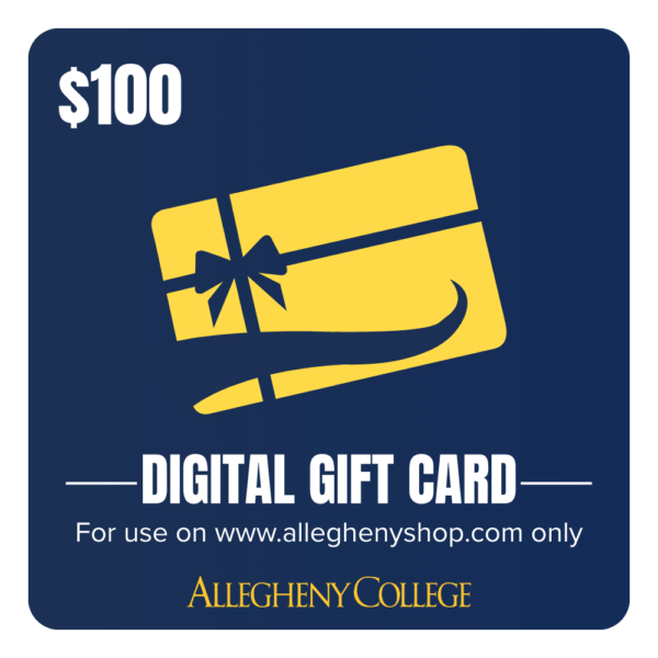 Navy image with gold gift card. White text that says digital gift card and $25. Below that is smaller white text saying for use only on www.alleghenyshop.com.