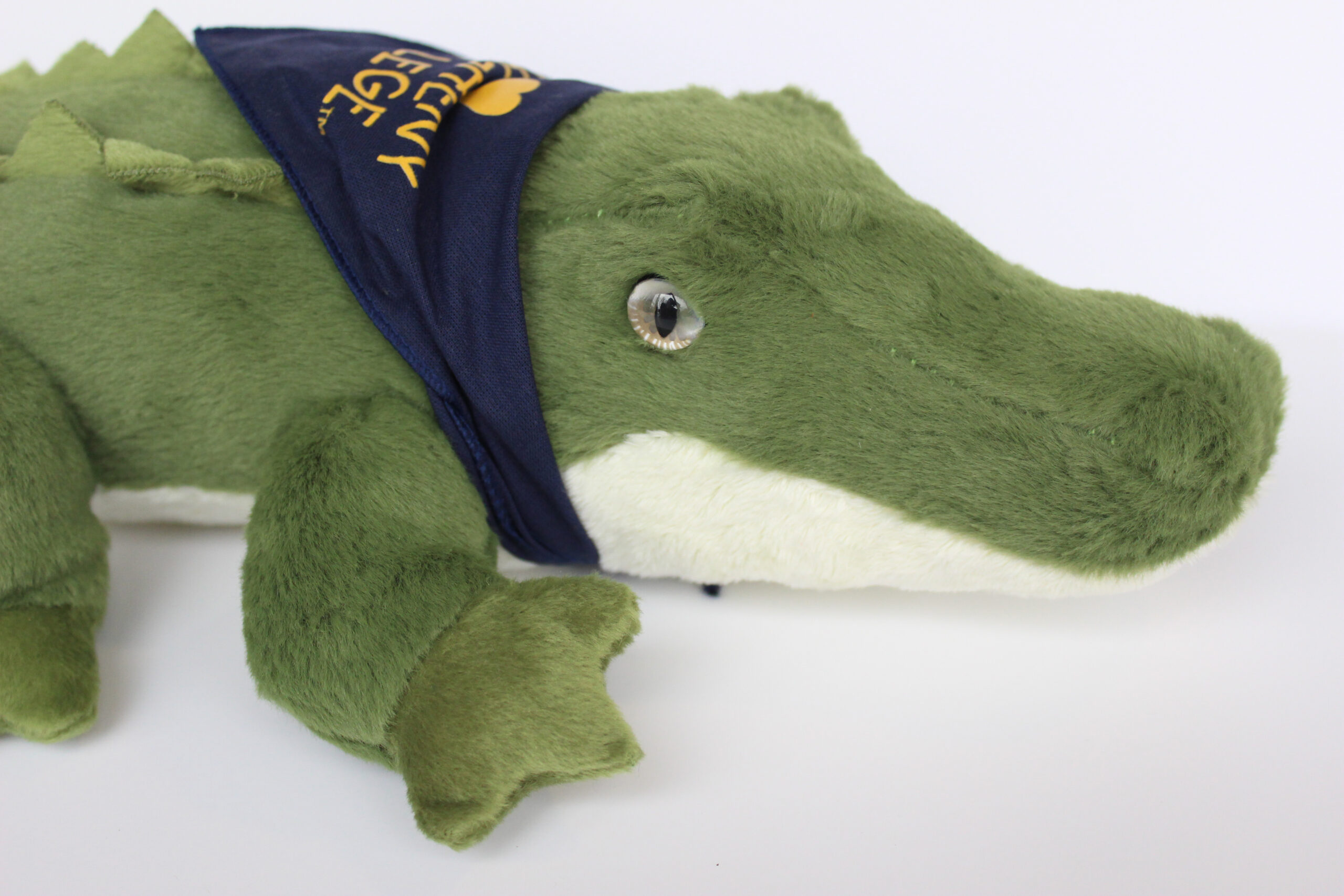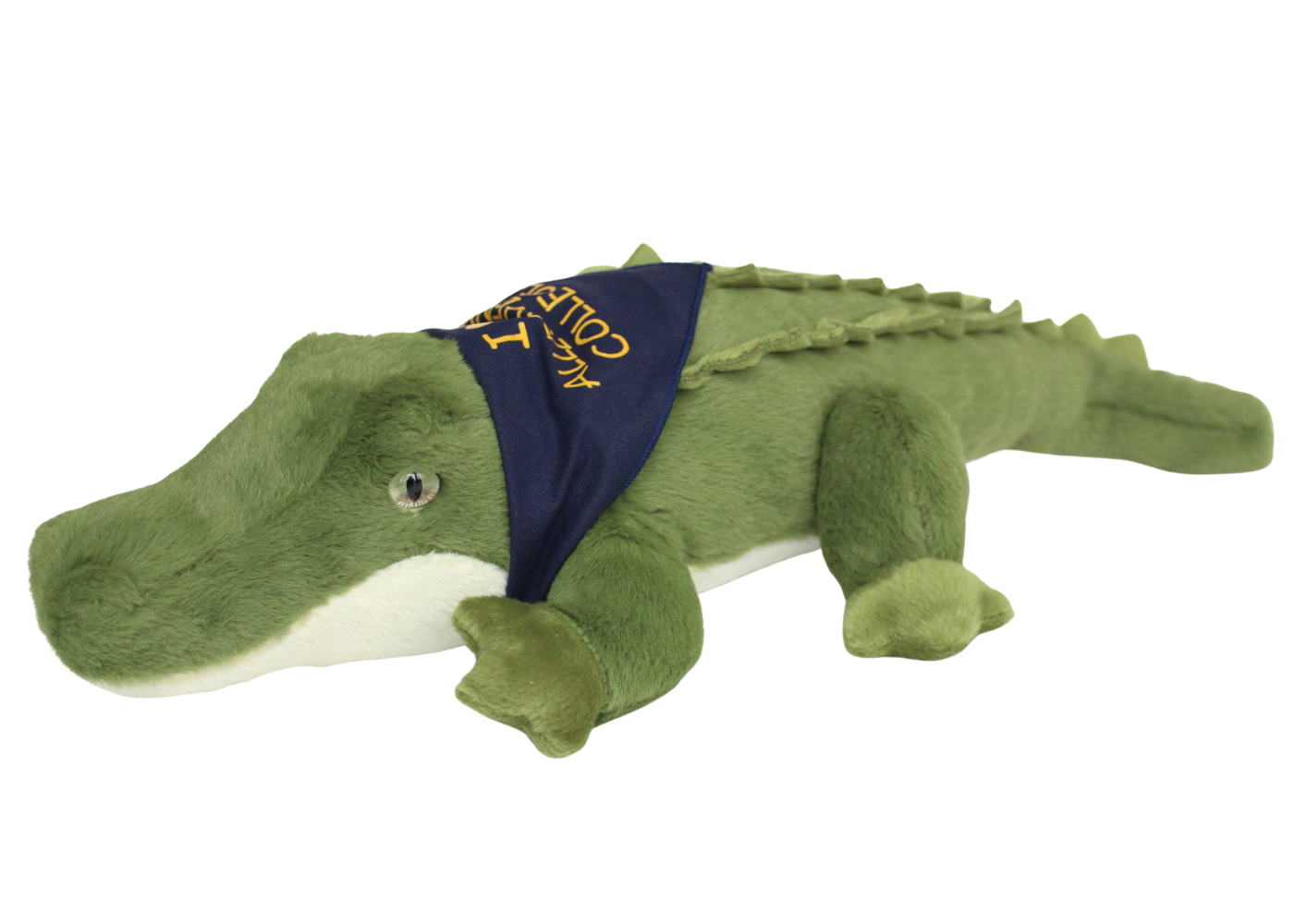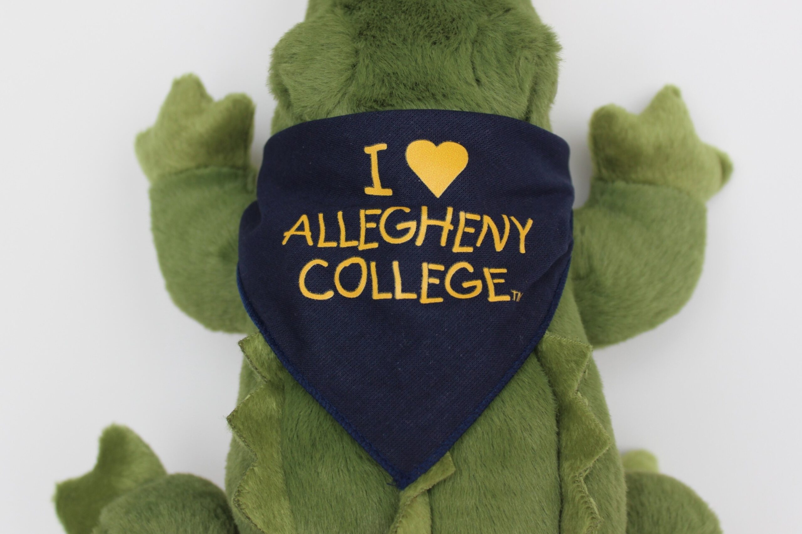 Green gator plush with navy bandana featuring “I ♡ Allegheny College” print