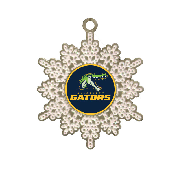 Gator logo snowflake pewter ornament. Ornament measures approximately 2.5″ wide and 3.5″ high. #412346
