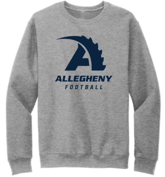 Silver and navy pewter ornament that says Allegheny College in white text and Football below in navy text. Navy outline of the gator logo on the backside of the ornament.
