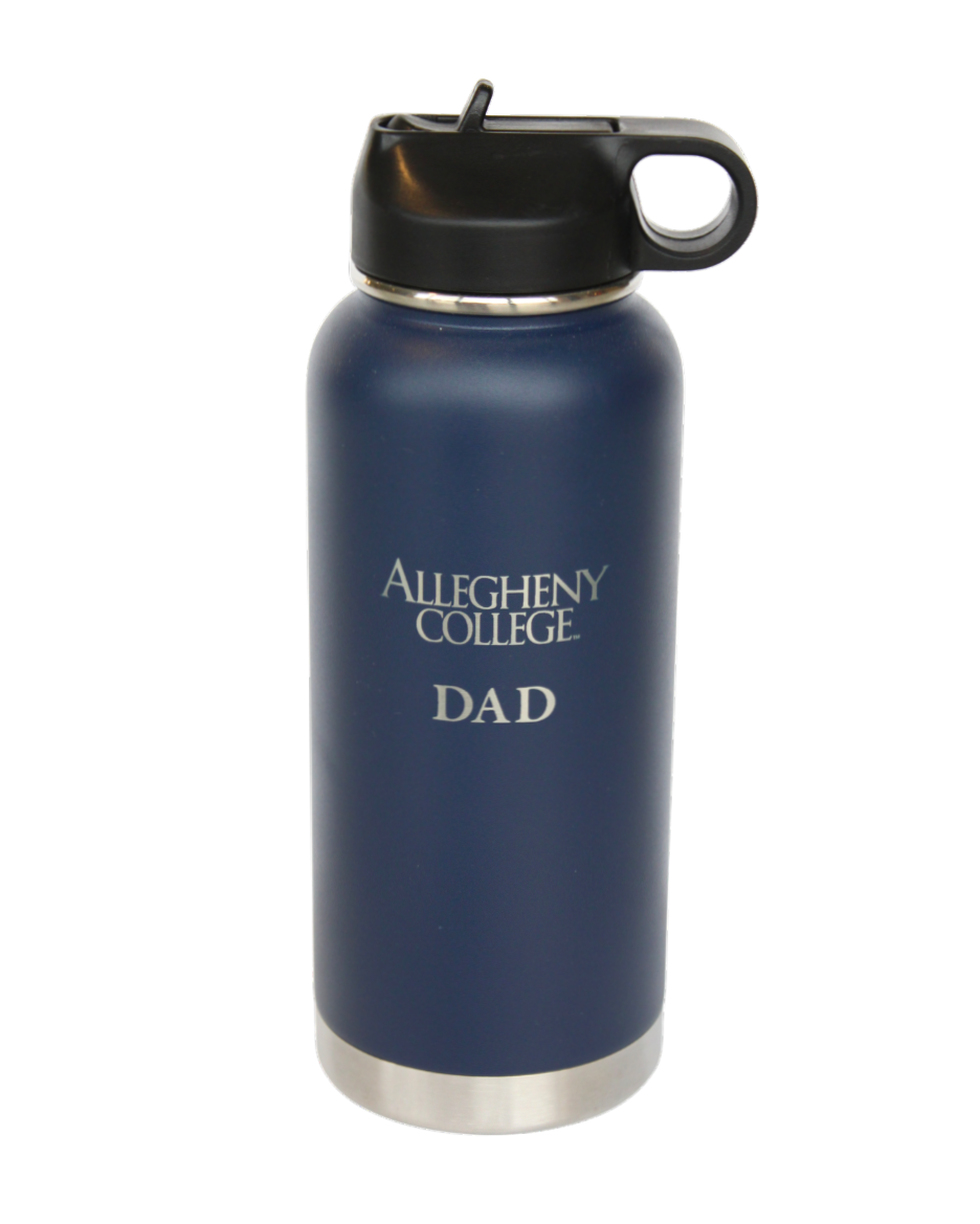 Navy stainless steel tumbler with silver inscription of “Allegheny College Dad.”