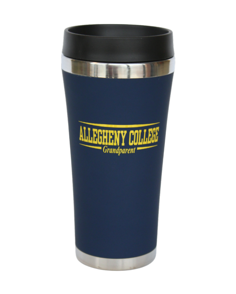 Navy stainless steel tumbler with gold “Allegheny College Grandparent” text and removeable lid.