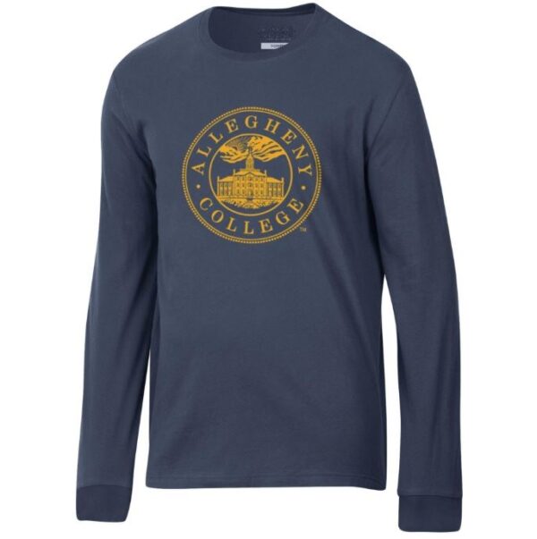 Navy long-sleeve tee shirt with modern seal silk screen imprint. Unisex sizing, 100% cotton. #411263