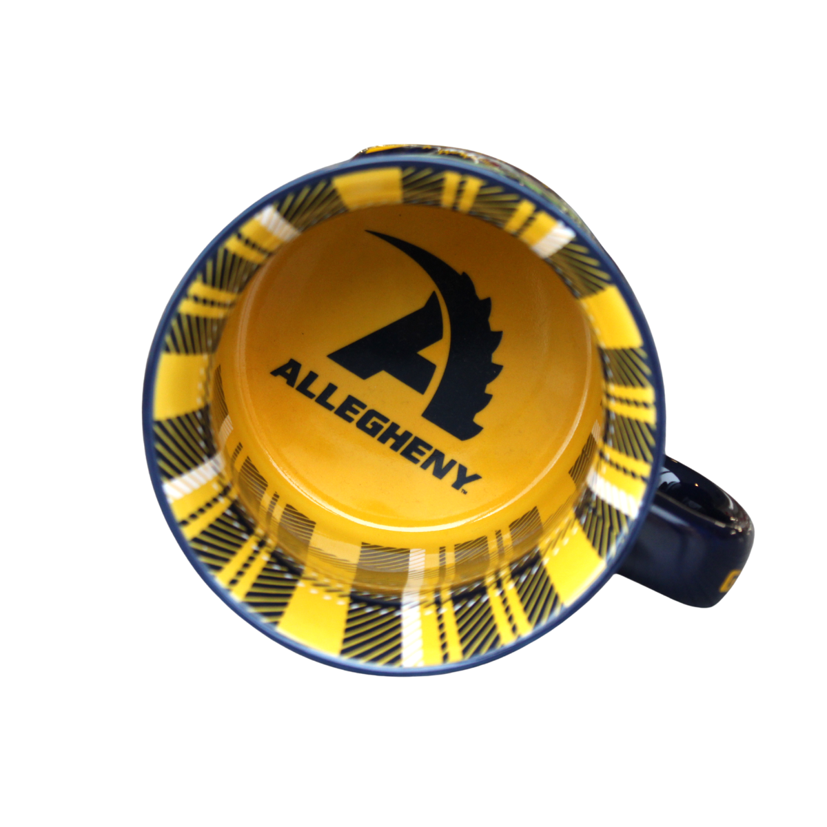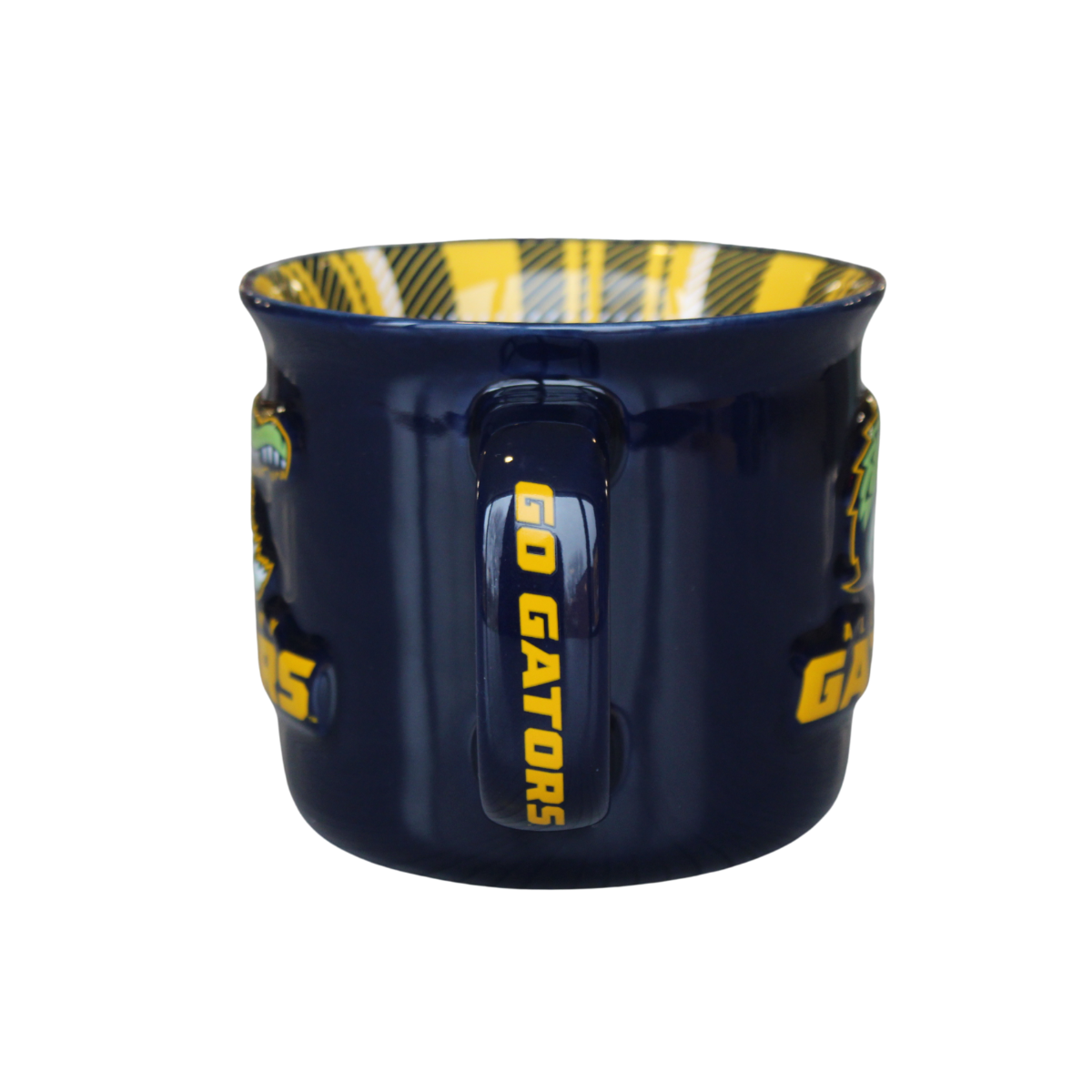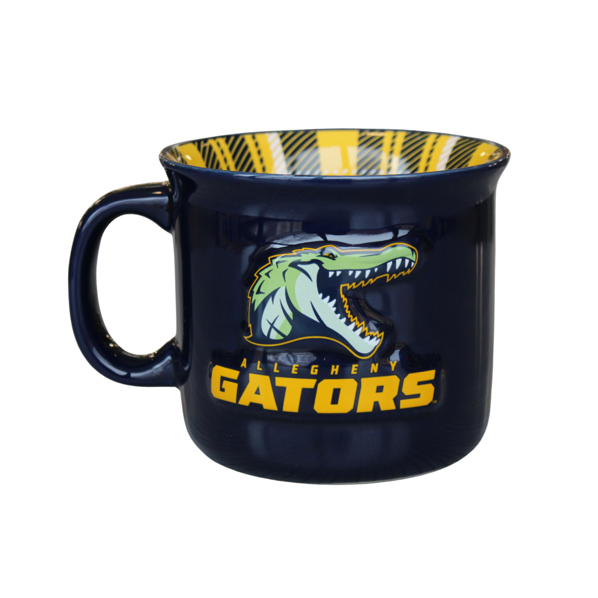 Navy relief mug with Gator logo and plaid interior. 23 oz, #412349.