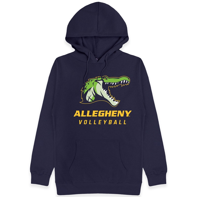 Hooded sweatshirt featuring large silk screen imprint of Allegheny Volleyball Gator logo.