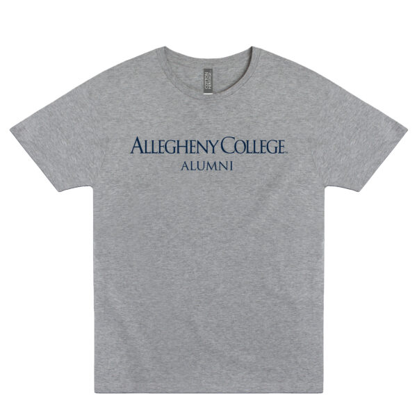 Gray Oxford t-shirt with silk screen imprint of Allegheny College wordmark and ALUMNI in navy.