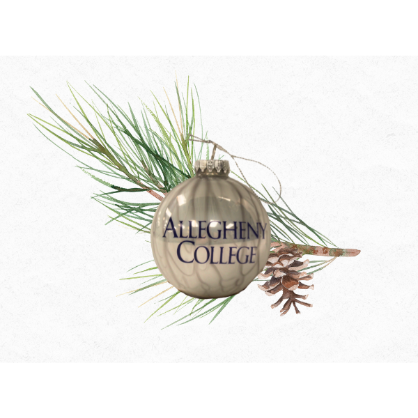 Silver ornament with the navy Allegheny College wordmark, measuring about 3″ in diameter.#412354