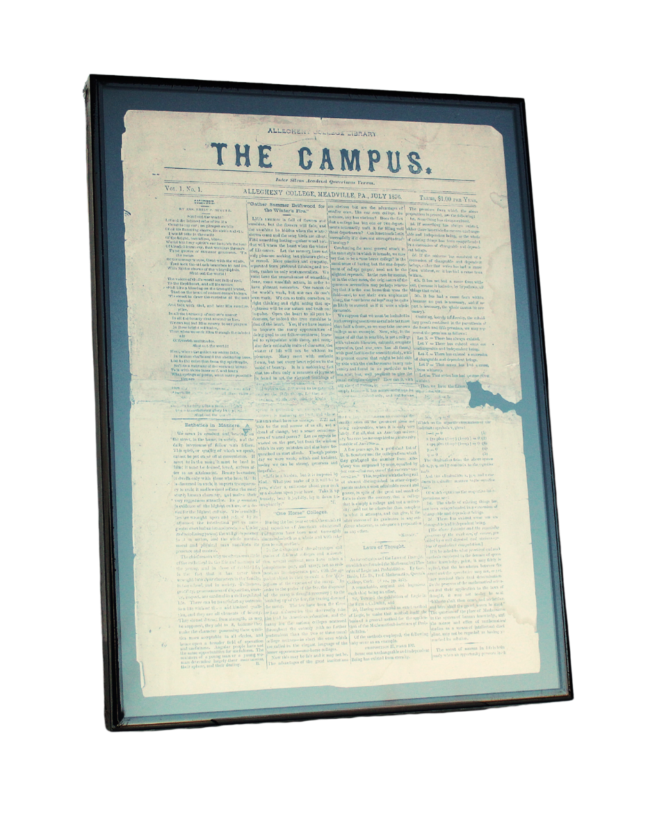 Light navy long sleeve crew neck sweatshirt. Centered front facing Allegheny College wordmark with 1815 capsule logo in between the wordmark.