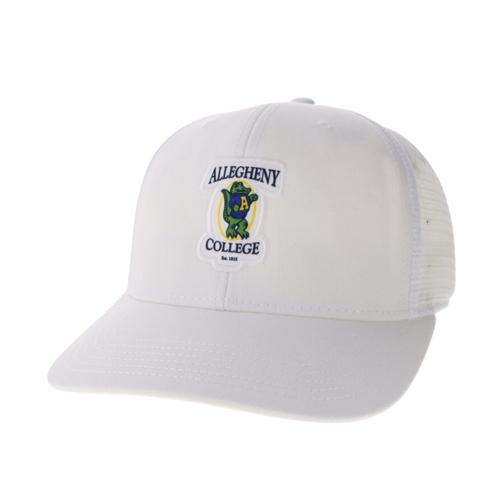 White Legacy trucker cap hat with an embroidered Vintage Gator logo patch. Adjustable strap, mesh back, and a visor made from recycled content.