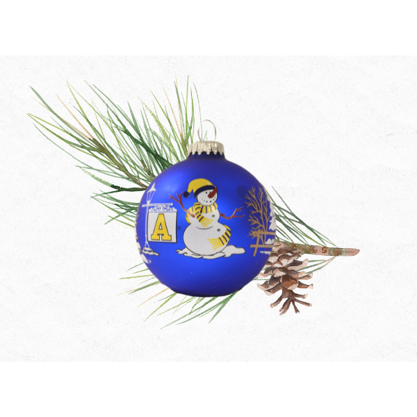 Ornament featuring a winter scene w/snowman and block A, measuring about 3″ in diameter.