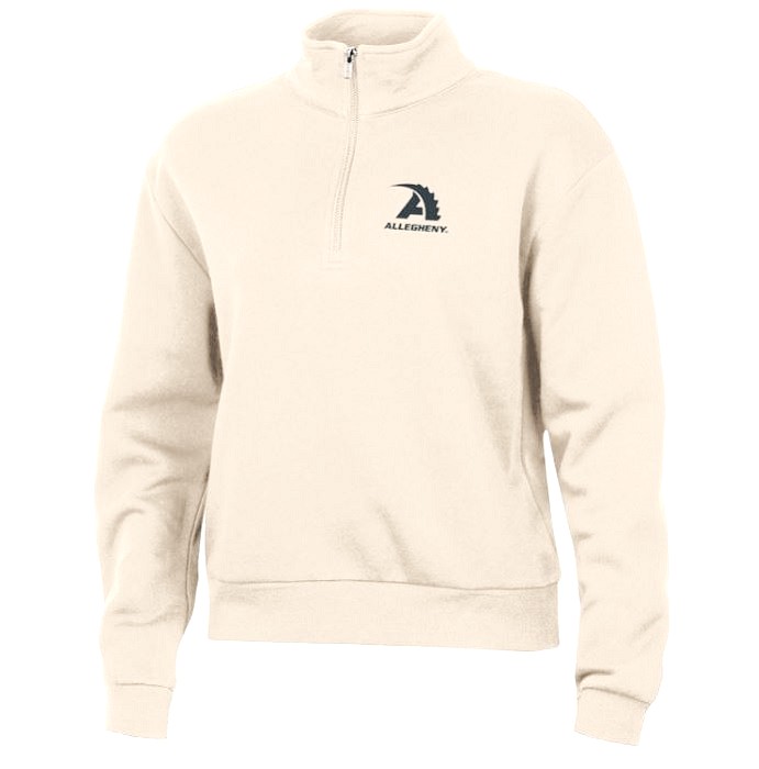 Women’s quarter zip in cream color with left chest embroidery. 77% cotton and 23% recycled polyester.